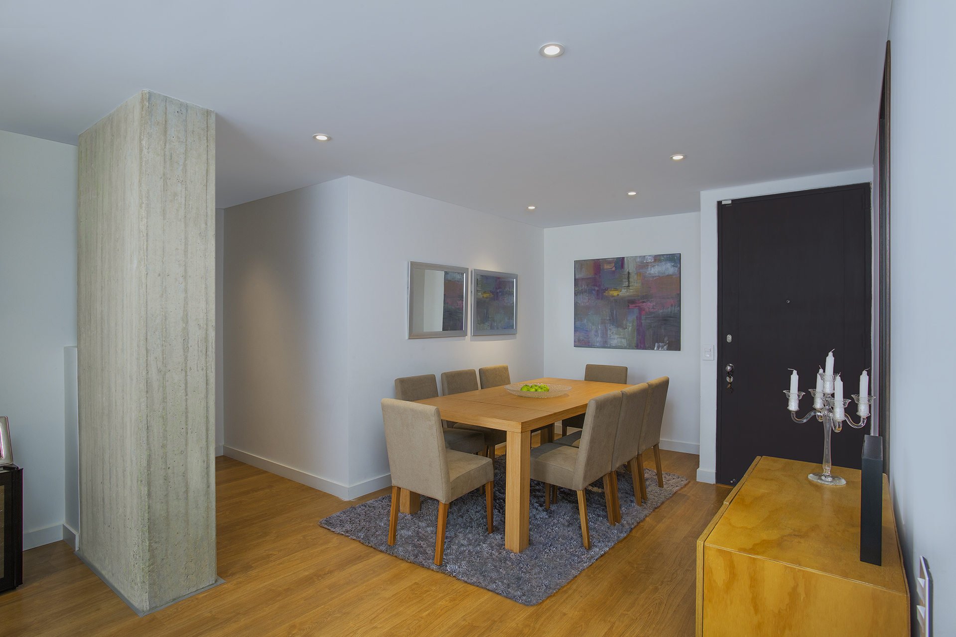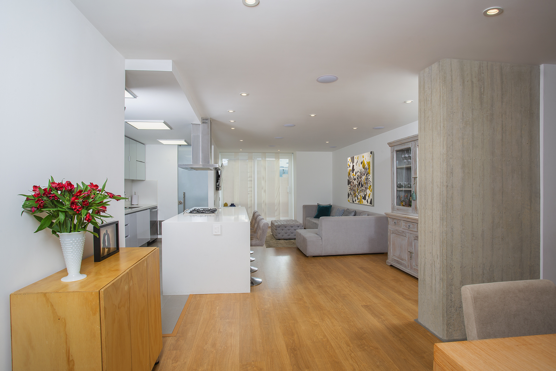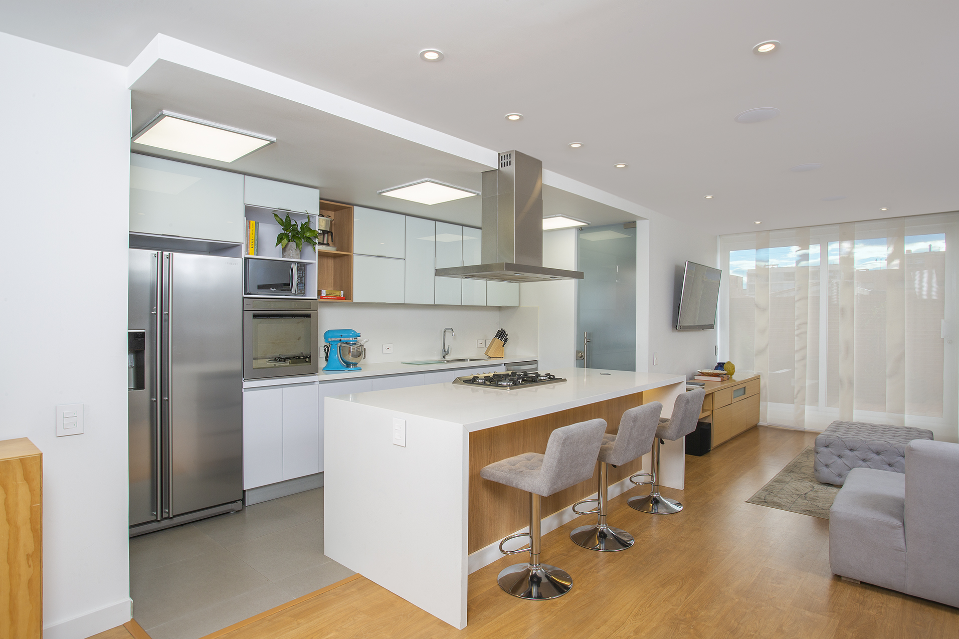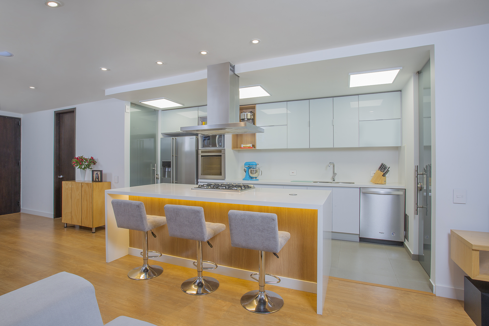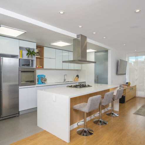 Este apartamento fue transformado para aprovechar al máximo cada espacio y adaptarse a una vida más abierta y contemporánea. La cocina se integró a la sala, convirtiéndose en el corazón del hogar, con una carpintería completamente renovada, nuevos electrodomésticos y una iluminación pensada para acompañar tanto lo funcional como lo social. La columna estructural se dejó a la vista como un elemento protagónico, aportando carácter y un atractivo visual que refuerza la identidad del espacio.