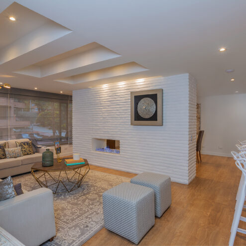 Este apartamento fue completamente renovado para optimizar su distribución y modernizar sus espacios. Se demolieron muros de mampostería para abrir la zona social, integrar una biblioteca, y ampliar la cocina, la zona de servicio y el baño principal.