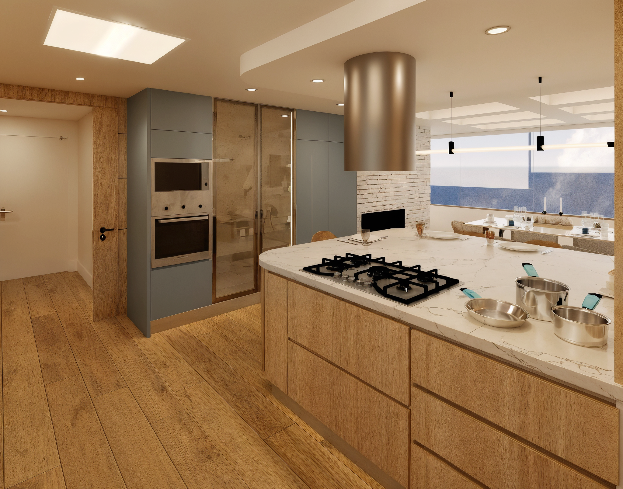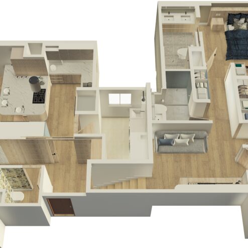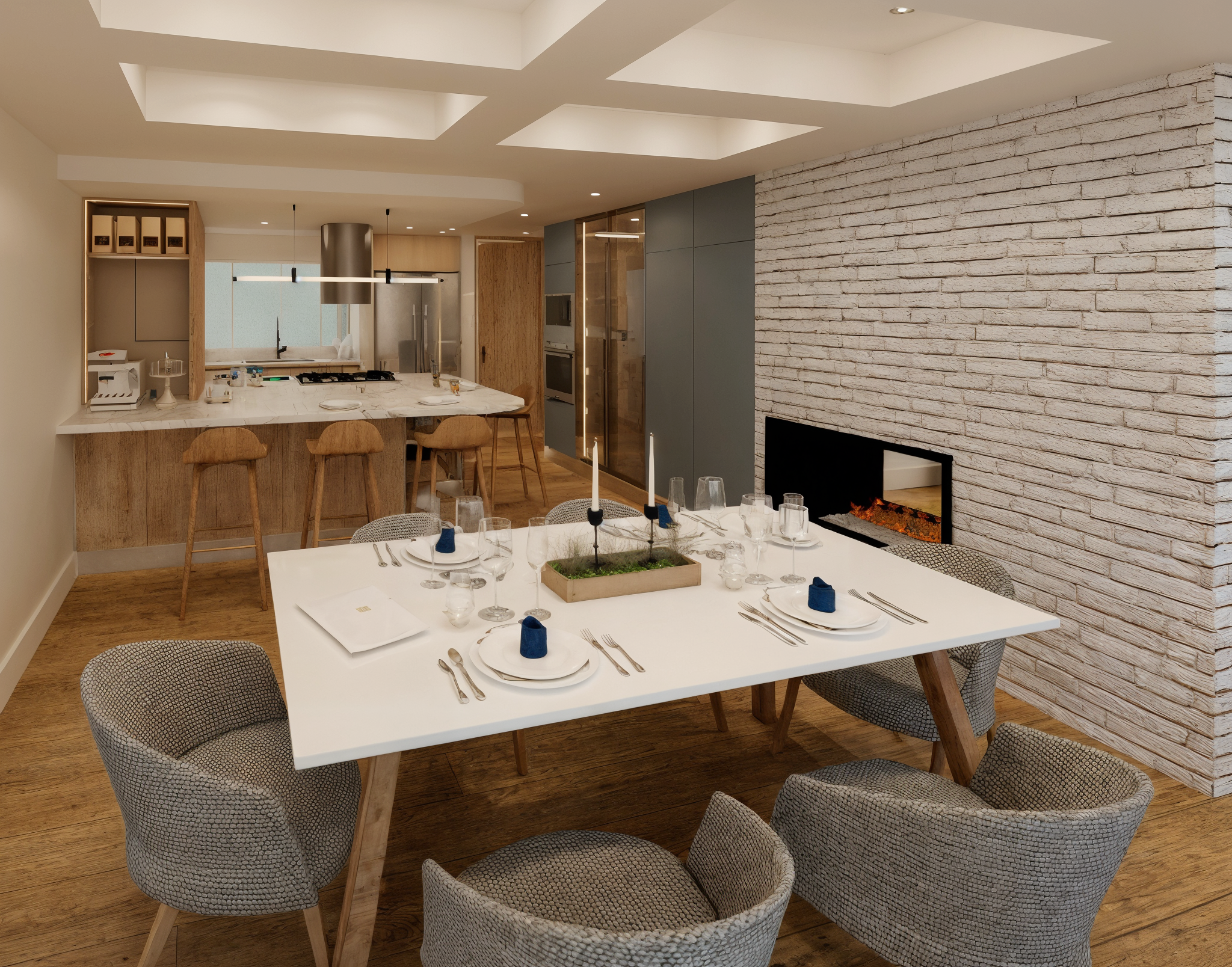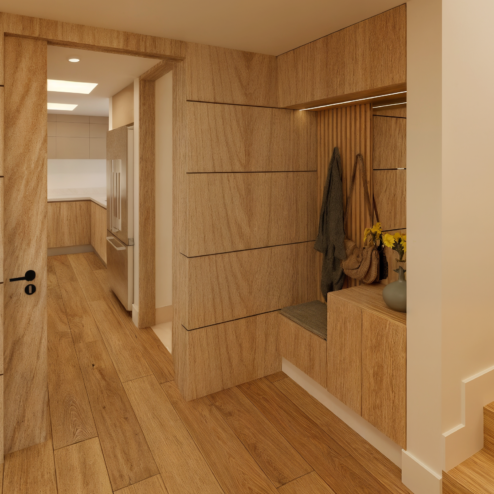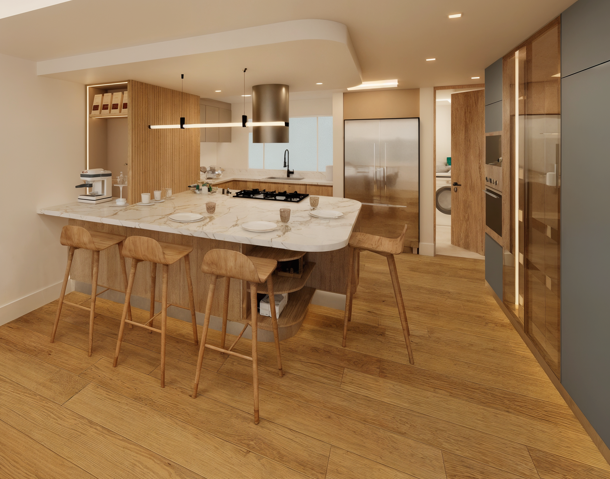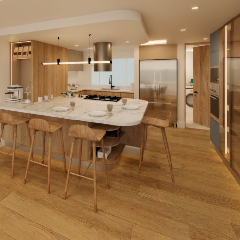 Una remodelación total que transforma este apartamento en un hogar contemporáneo, cálido y lleno de carácter. La cocina abierta se integra naturalmente con el comedor a través de una península funcional con almacenamiento, estufa y estación de café, acompañada de una iluminación lineal descolgada que enmarca el espacio de barra. La combinación de carpinterías en madera clara, taupe y un acento azul crea un contraste elegante, mientras la alacena en vidrio con iluminación LED aporta ligereza y sofisticación.
