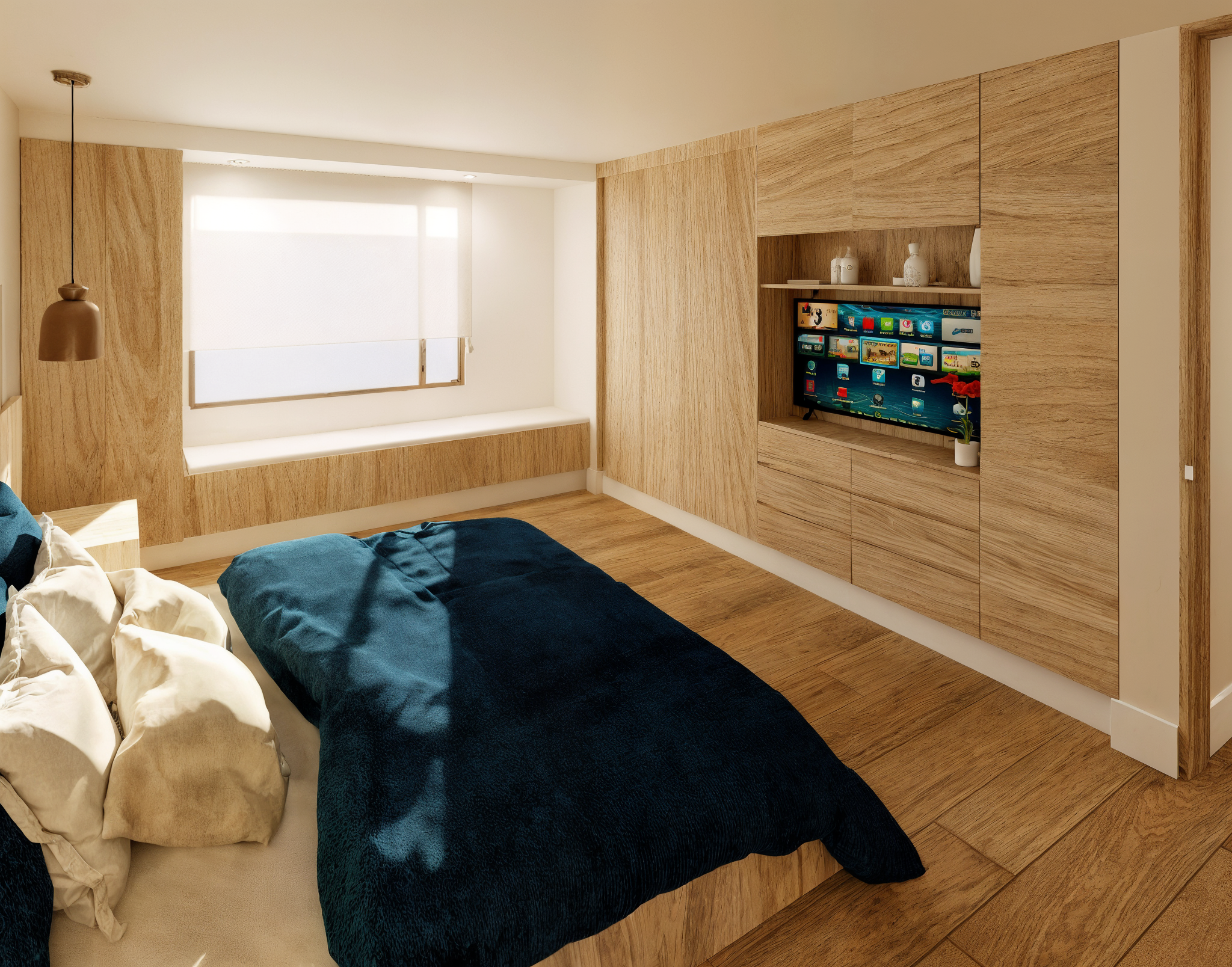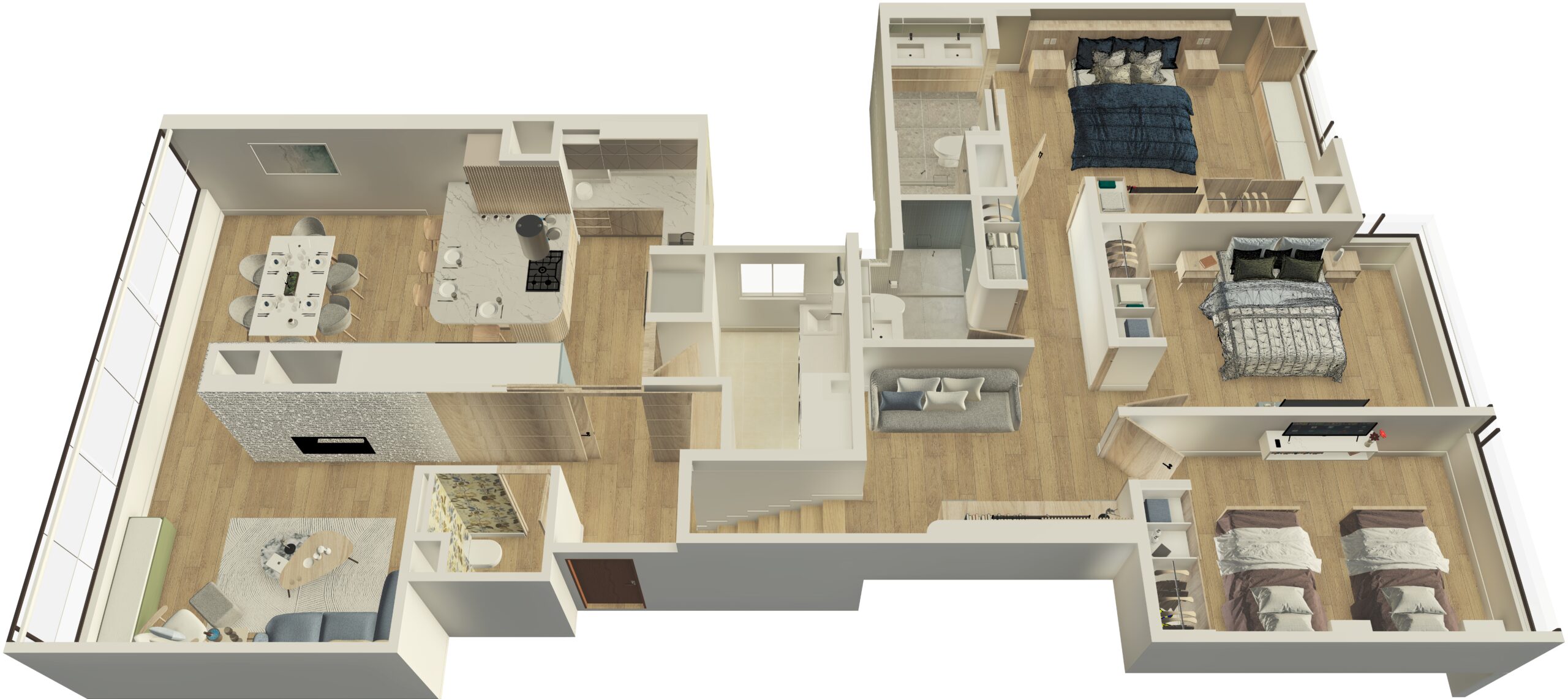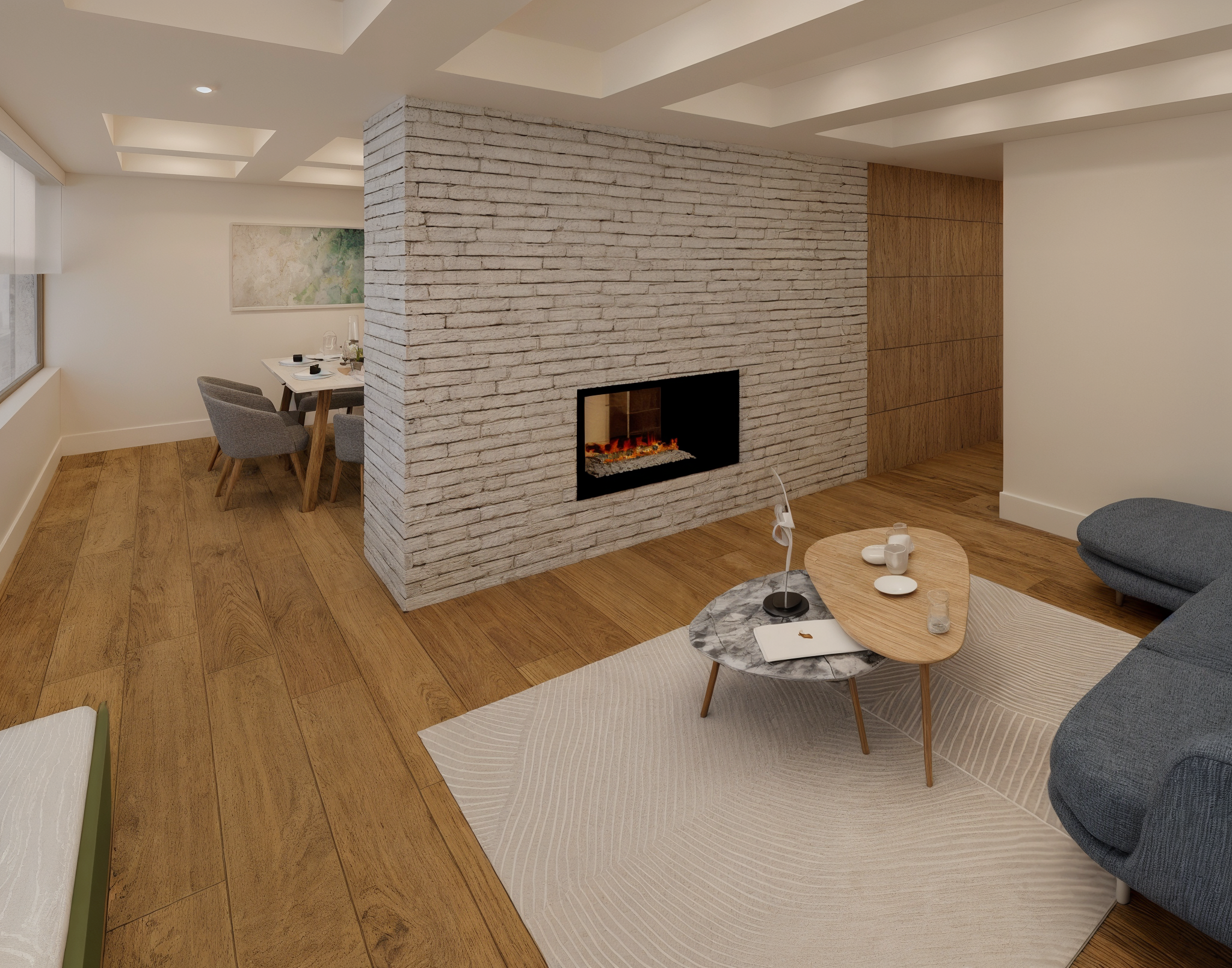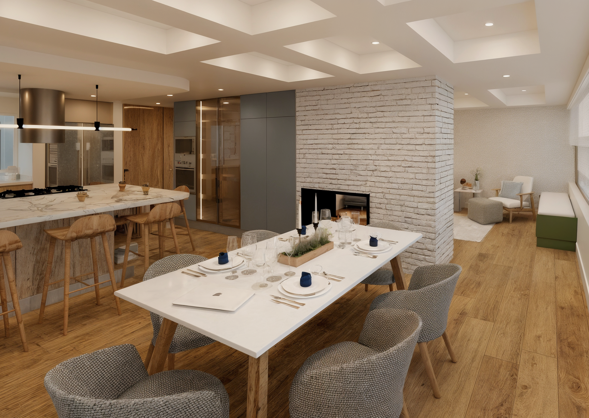 Una remodelación total que transforma este apartamento en un hogar contemporáneo, cálido y lleno de carácter. La cocina abierta se integra naturalmente con el comedor a través de una península funcional con almacenamiento, estufa y estación de café, acompañada de una iluminación lineal descolgada que enmarca el espacio de barra. La combinación de carpinterías en madera clara, taupe y un acento azul crea un contraste elegante, mientras la alacena en vidrio con iluminación LED aporta ligereza y sofisticación.