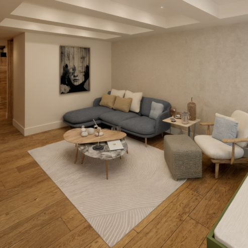 La experiencia del hogar continúa en cada detalle: una sala acogedora con nichos iluminados en el cielo raso, chimenea integrada y muros en ladrillo vintage blanco que conservan la esencia del espacio. Los baños se diseñan con acabados sobrios y elegantes, destacando el baño social con grifería dorada, papel tapiz y luminarias que sorprenden a los invitados. En la habitación principal, el mobiliario a medida, el rincón de lectura y los amplios espacios de almacenamiento crean un refugio de confort.