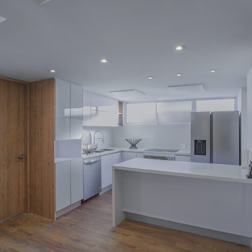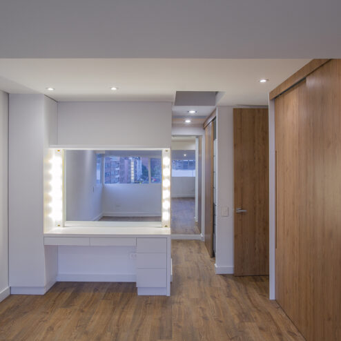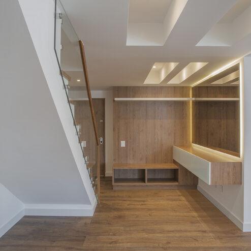 Este dúplex fue cuidadosamente intervenido para lograr un hogar más moderno, luminoso y funcional. Se reemplazó el tapete original por un elegante piso laminado y los pasos de la escalera fueron revestidos en chapilla de madera, aportando calidez y continuidad visual. La cocina se abrió completamente hacia la zona social, mientras que se rediseñó el baño social con un estilo contemporáneo y se reubicó estratégicamente para ampliar la cocina. También se mejoró la zona de ropas, haciéndola más cómoda y práctica, y se eliminaron elementos como la chimenea para dar paso a un diseño más limpio y actual.