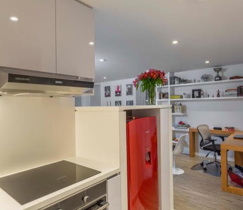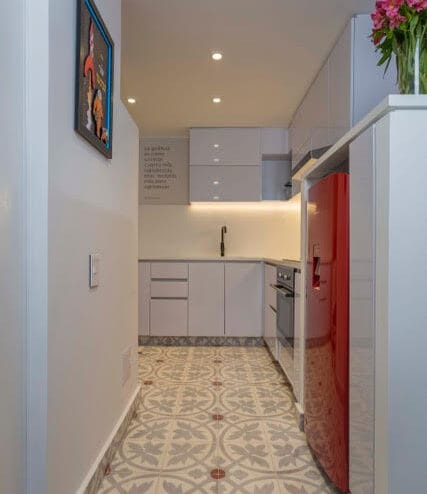 Este apartamento demuestra que el tamaño no limita el diseño. A través de una renovación integral, se cambió por completo el piso, se modernizó la cocina y se diseñaron muebles estilizados a la medida, optimizando cada centímetro con funcionalidad y estética. La iluminación fue redistribuida estratégicamente para aportar amplitud y calidez, creando espacios versátiles que se sienten más grandes, más claros y más acogedores.