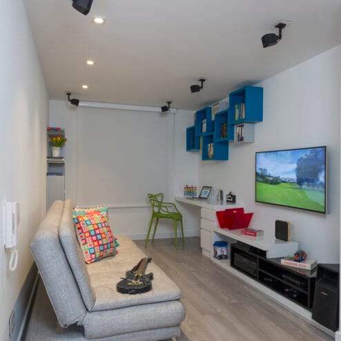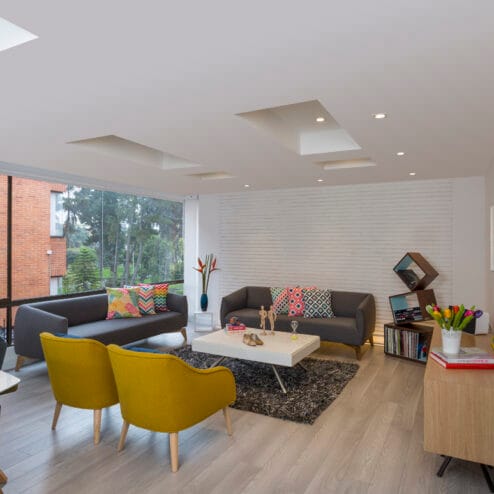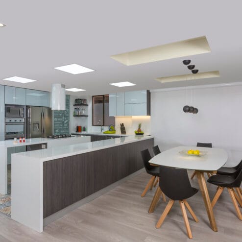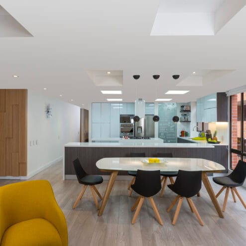 Transformar un apartamento va más allá de renovar acabados: es reinventar la manera de habitarlo. En este proyecto, abrimos la cocina y el comedor para integrarlos con la sala en un solo espacio amplio y lleno de luz, donde un sutil enchape hidráulico marca la transición entre ambientes sin perder armonía. Los nichos de luz en el cielo raso y las columnas estructurales dejadas a la vista añaden carácter y calidez, creando un entorno moderno y acogedor. En el acceso, se instaló un enchape en carpintería que funciona como un hito visual y, al mismo tiempo, oculta discretamente el ingreso al baño social.
