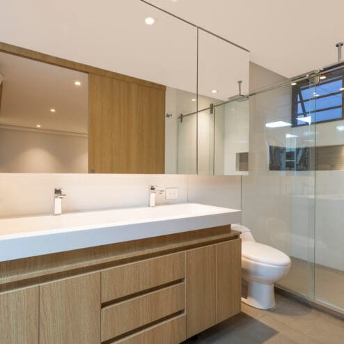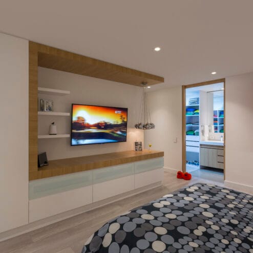 Cada decisión en esta remodelación fue pensada para mejorar la funcionalidad del hogar. Se reemplazó por completo el piso, se amplió la zona de ropas, y el baño de servicio fue transformado en un baño auxiliar para las alcobas. Toda la carpintería y los acabados se renovaron, y el baño principal se amplió para brindar mayor confort, al igual que el vestier, que aprovechó el espacio del antiguo baño de alcobas eliminado.