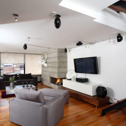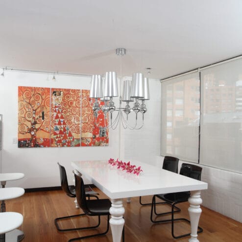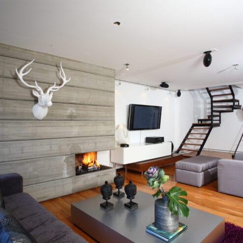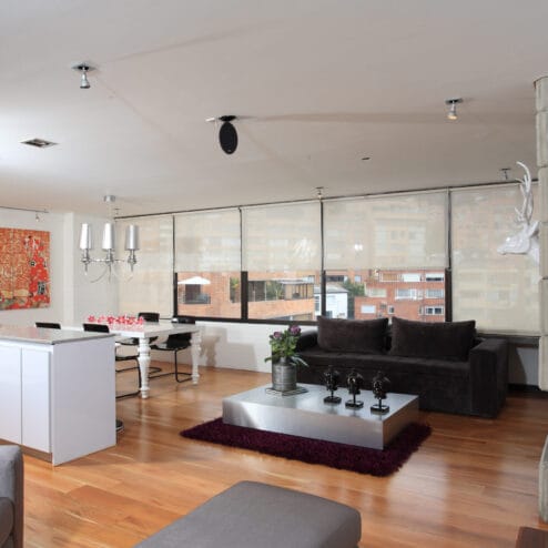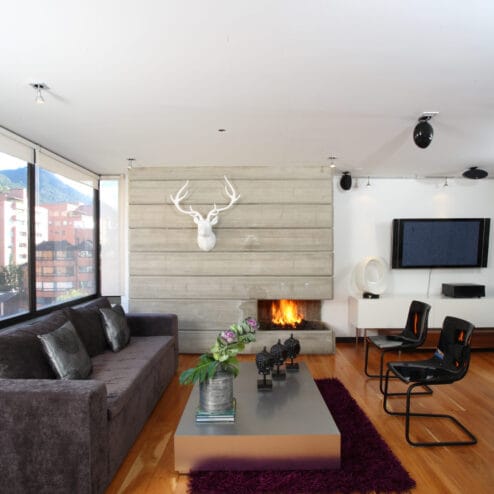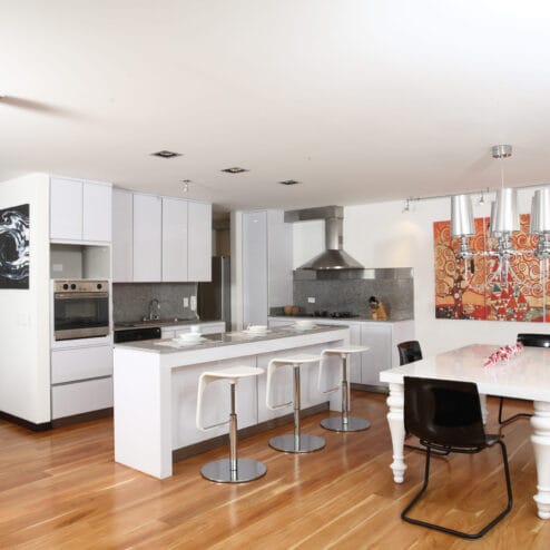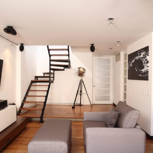 Este dúplex fue intervenido con sensibilidad y carácter, resaltando lo existente y sumando detalles que elevan la experiencia de habitarlo. Se pulieron los pisos y las escaleras de madera, y se retiró la baranda para dar mayor ligereza visual al recorrido. La cocina conservó su distribución original, pero fue revitalizada con nueva carpintería, mientras que la chimenea a gas ganó protagonismo al enmarcarse con una textura de microcemento que la convierte en el centro cálido de la zona social.