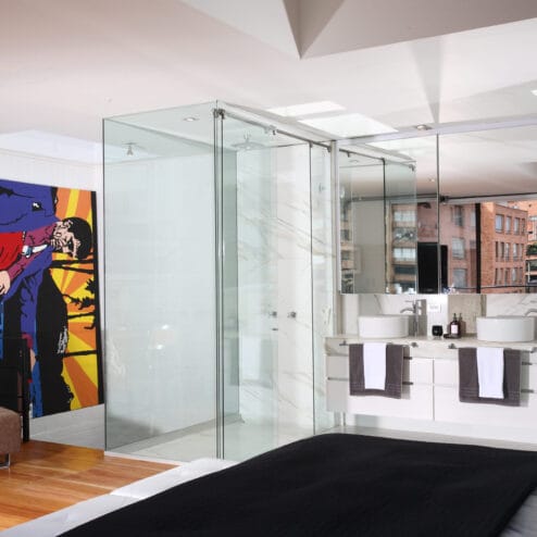 En el segundo piso, la transformación fue total: se incorporó un cielo raso que aporta unidad y se diseñó una zona privada abierta e integrada, respondiendo al estilo de vida del cliente. El baño se conecta directamente con la habitación, y un muro detrás de la cama da forma a un vestier amplio, sin cerramientos, que aporta orden sin perder fluidez.