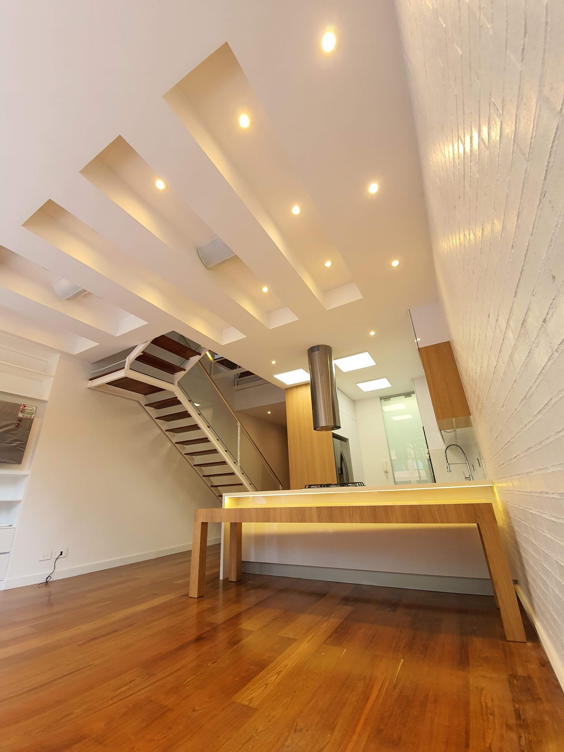 Esta casa de tres pisos fue transformada para aprovechar cada metro con inteligencia y diseño. La cocina se renovó con una carpintería más amplia y funcional, mientras que la chimenea colgada a gas aporta un carácter contemporáneo y liviano al área social. La sala se hizo más acogedora, incorporando nichos de iluminación en el cielo raso que brindan una visual más cómoda y permiten integrar de forma discreta el sistema de sonido. Las escaleras, ahora en blanco con barandas en vidrio y pasamanos en madera, conectan los niveles con una sensación de ligereza y modernidad.