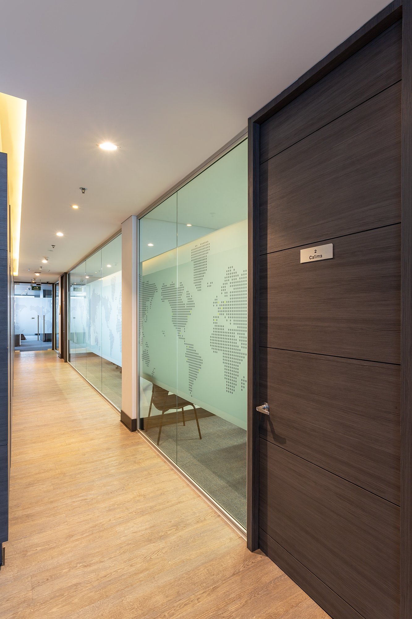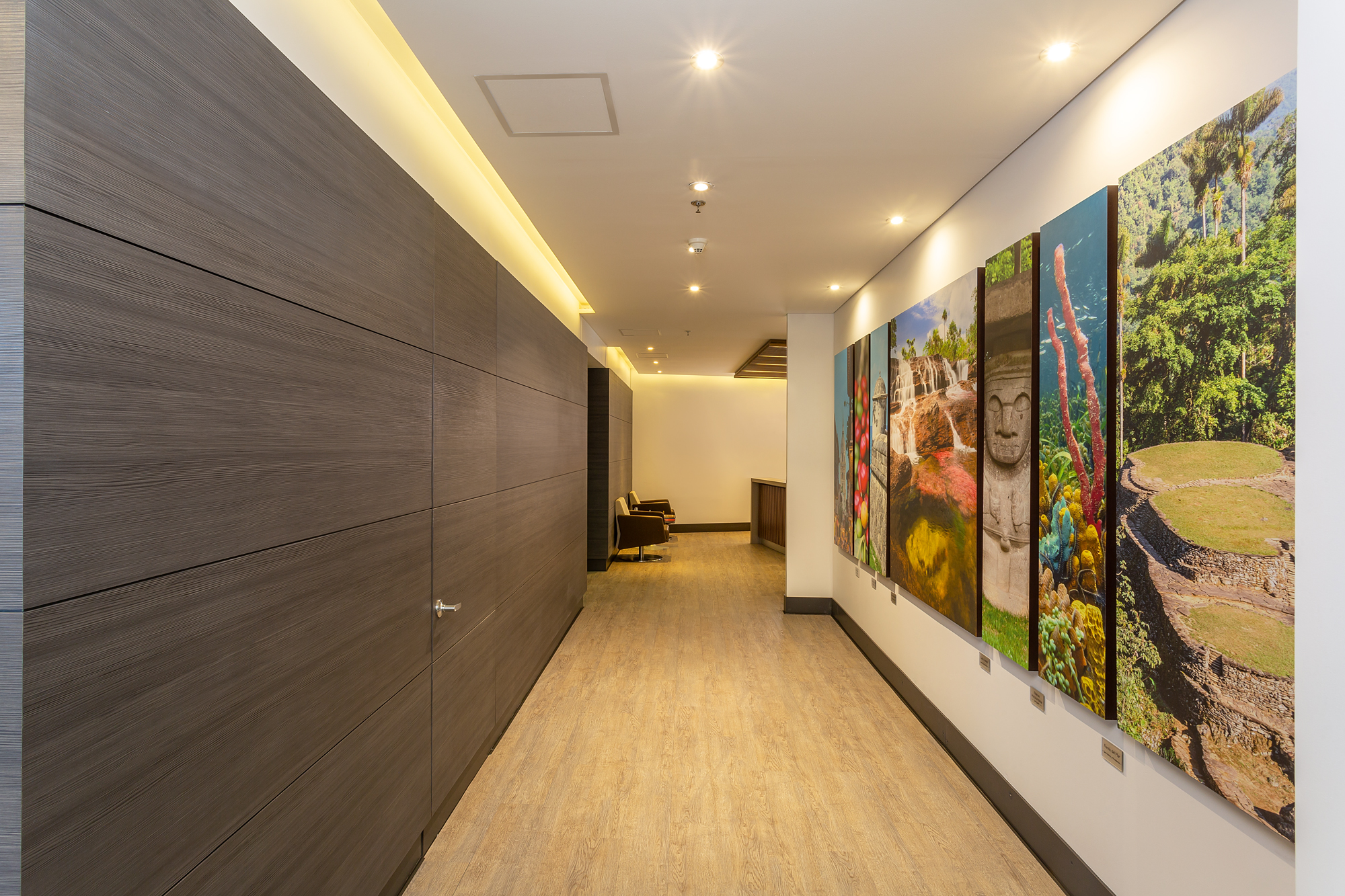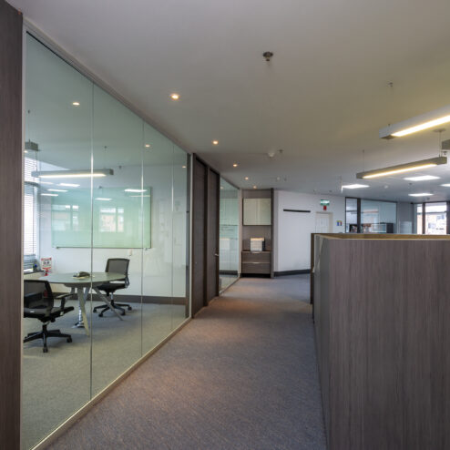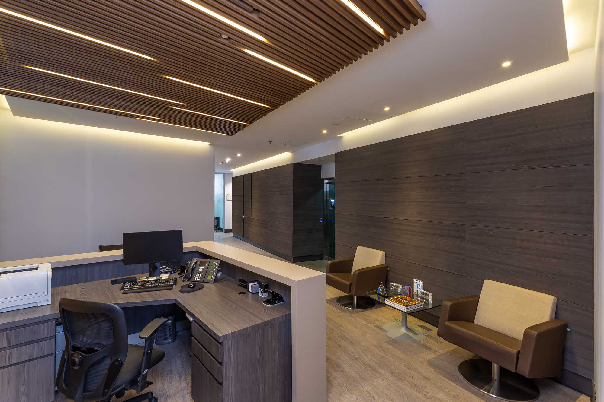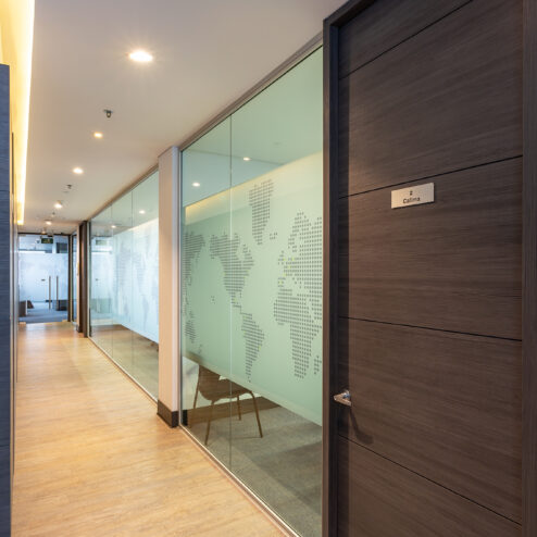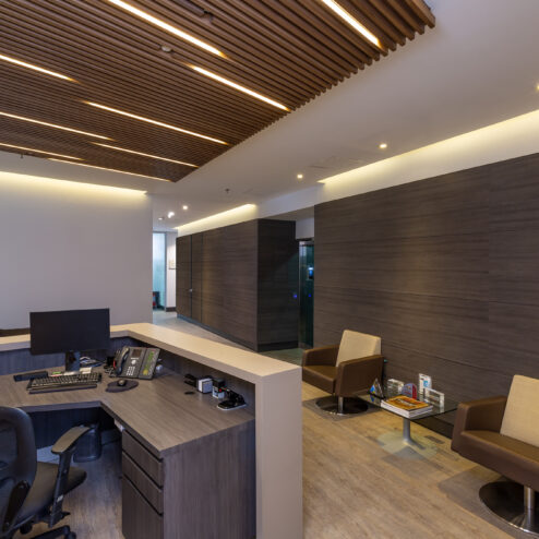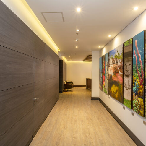 Estas oficinas fueron transformadas para reflejar profesionalismo y modernidad en cada detalle. La renovación inició con una recepción completamente actualizada, que da la bienvenida con una imagen fresca y corporativa. Se reemplazaron los pisos de pasillos y sala principal, aportando un acabado elegante y resistente que realza la estética del espacio.