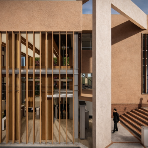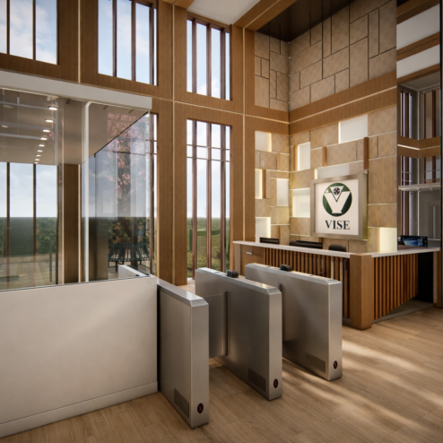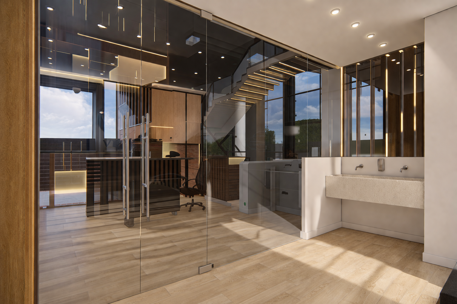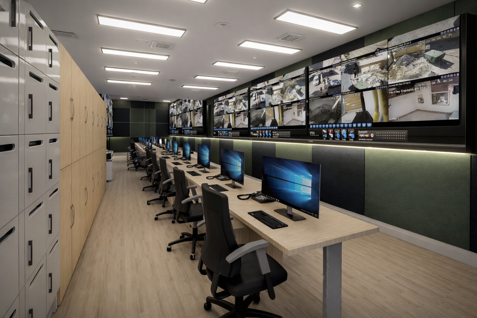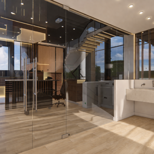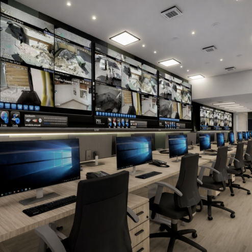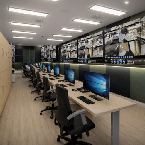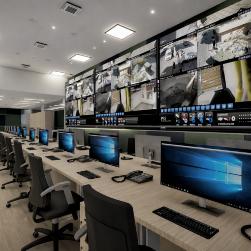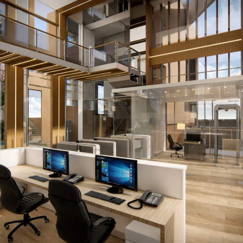 En este proyecto, la arquitectura se convierte en una herramienta para comunicar confianza, tecnología y eficiencia. Las oficinas fueron rediseñadas para integrar áreas estratégicas como la recepción, sala de monitoreo y de crisis, creando un entorno profesional donde cada espacio refleja el nivel de especialización de la empresa. Cada espacio fue pensado para integrar tecnología, seguridad y diseño, permitiendo que clientes y colaboradores perciban el alcance real de la empresa. Los elementos de control de acceso, junto con materiales cálidos y una iluminación bien estudiada, generan un equilibrio entre lo técnico y lo humano.